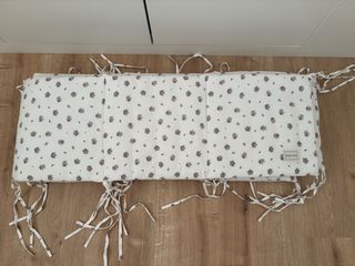 Protector de cuna de la marca Minicoton con un bonito estampado floral. - Diseño con pequeñas flores en tonos morados y ocres sobre fondo blanco. - Tejido suave y acolchado. - Incluye cintas para atar y asegurar. - Etiqueta de la marca visible. Precio en tienda:99,90€