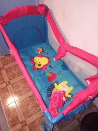 Cuna de viaje para bebés, con un diseño muy colorido y divertido. Se encuentra en buen estado. - Estructura plegable para facilitar su transporte. - Tonos vibrantes y alegres.