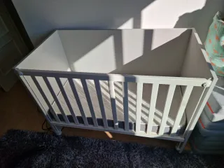 Cuna de madera de haya con un diseño clásico y seguro para tu bebé. Sus barrotes permiten una buena ventilación. - Material: Madera de haya. - Medidas: 60x120 cm. La base de la cuna se puede montar a dos alturas diferentes. Garantiza a tu bebé seguridad y confort, porque los materiales resistentes de la base de la cuna han sido probados para ofrecer el soporte que necesita. La base de la cuna permite que circule el aire y se cree un entorno de descanso agradable para tu hijo toda la noche. Vendo con el colchón, 2 protectores para colchón y con protector de cuna IKEA