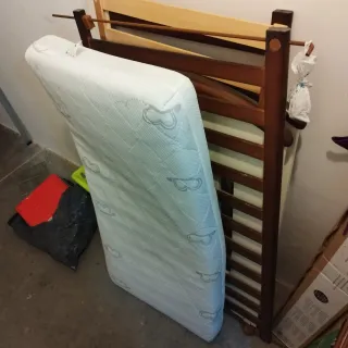 Se vende cuna de bebé de madera oscura con un colchón transpirable. - Estructura de madera resistente. - Colchón con funda. - Diseño clásico.