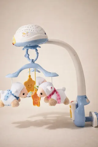 Móvil musical para cuna con proyector de luces y figuras de ovejas y estrellas. VERSIÓN EN ESPAÑOL: Móvil musical y luminoso con proyector y mando a distancia para bebés +0 meses. 3 TIERNAS OVEJITAS DE PELUCHE: Giran suavemente al ritmo de las 40 melodías, 4 nanas y numerosos sonidos de la naturaleza para reconfortar al bebé. SENSOR DE SONIDO: Activa melodías relajantes cuando detecta el llanto del bebé. PROYECTOR EXTRAÍBLE: Se puede utilizar de luz de noche con varios colores que cambian aleatoriamente. Incluye mando a distancia para controlar el móvil y temporizador.