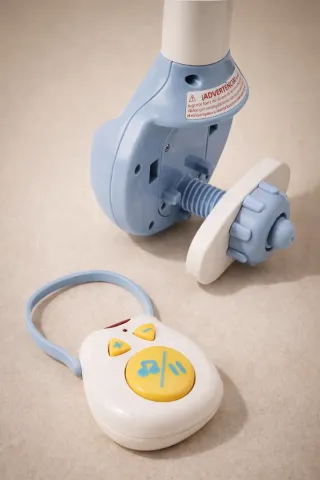 Móvil para cuna con música y simpáticas figuras colgantes. - Diseño con estampado de topitos azules y blancos. - Figuras de búhos y estrellas. - Estructura de plástico blanco y brazo flexible.