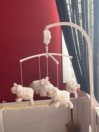 Móvil musical para cuna con adorables ovejas de peluche. Añade un toque tierno y relajante al espacio del bebé. - Diseño de ovejas blancas. - Melodía musical.