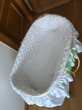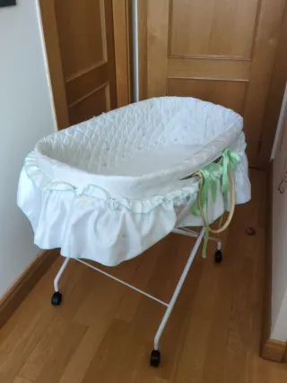 Minicuna con cuerpo de mimbre color natural .Incluye colchón, vestidura blanca y detalles en verde. - Estructura metálica blanca con ruedas. - Volante decorativo. Venta en persona.