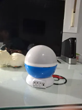 Lámpara de noche con proyecciones de estrellas que giran. Ideal para crear un ambiente relajante. - Diseño esférico con base blanca y cúpula azul. - Botones de control A, B y C.