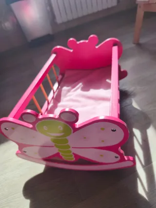 Cuna de madera para muñecas, con un diseño de mariposa. - Color rosa vibrante. - Detalles de mariposa pintada en los extremos. - Mecanismo balancín para acunar. - Incluye colchón rosa. -41'5 cm de largo y 27 cm de ancho