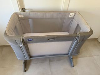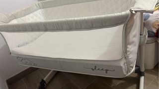 Cuna colecho Chicco en color gris, con laterales de malla transpirable. - Estructura metálica. - Ruedas para facilitar el movimiento. - Altura regulable.