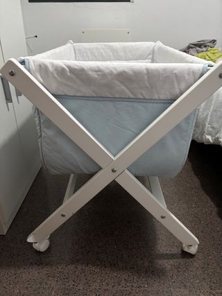 Preciosa cuna moisés en perfecto estado. Ideal para los primeros meses del bebé. - Estructura de madera blanca. - Tejidos suaves en tonos beige con estampado de estrellas. - Incluye colchón y almohada a juego.