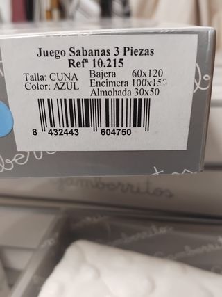 Juego de sábanas para cuna de 3 piezas en color azul claro. - Incluye bajera (60x120 cm), encimera (100x150 cm) y almohada (30x50 cm). - Referencia: 10.215. - Código de barras: 8432443604750.