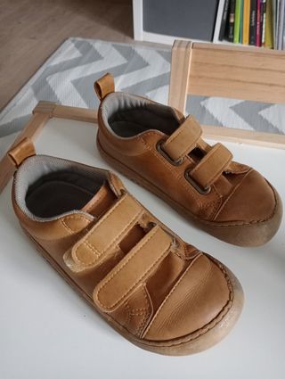 Zapatos de piel en color coñac, perfectos para el día a día. - Cierre con doble velcro. - Suela de goma. - Detalle de pespuntes. La punta en el zapato derecho desgastado.