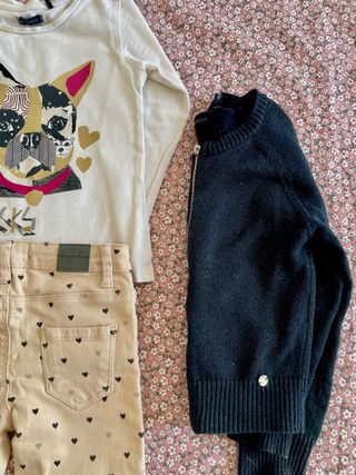 Conjunto de ropa infantil de las marcas IKKS y Zara. talla 2-3 años. - El pantalón beige con corazones es de Zara y está como nuevo, puesto en un par de ocasiones. - El jersey es de IKKS, está muy bien, tiene muy poco uso. - La camiseta con estampado de perro es de IKKS. Está más usada y tiene alguna mancha en la parte trasera de la manga…pero está muy bien para seguir utilizándola.