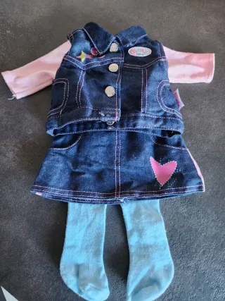 Conjunto de ropa para muñeca Baby Born. - Falda vaquera con detalles. - Chaleco vaquero. - Camiseta de manga larga rosa. - Leotardos azules.