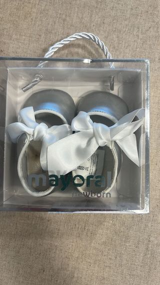 Preciosos zapatos para bebé de la marca Mayoral. - Color plata. - Detalle de lazo blanco. - Presentados en su caja original.