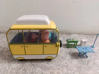 Furgoneta de Peppa Pig para acampar, con todos sus accesorios. - Incluye figuras de Peppa Pig. - Mesa de picnic con platos y cubiertos. - Barbacoa. - Nevera. - Paraguas. - Mástil.