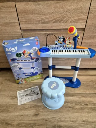 Teclado electrónico infantil con temática de Bluey. Ideal para los más pequeños. - Melodías y sonidos de percusión. - Función de grabación. - Edad recomendada: 3+ años. Nuevo con luz y sonido