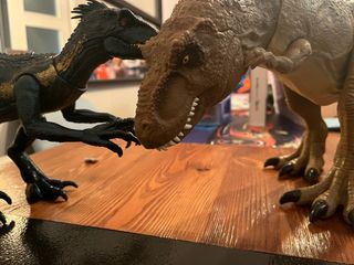 Set de figuras de dinosaurios Indominus raptor y T-Rex. - Figura Indominus raptor azulada con detalles dorados. Se le iluminan los ojos y abre la boca con sonido. - Figura T-Rex marrón con detalles realistas. Mueve cuello y mandibula con sonido.