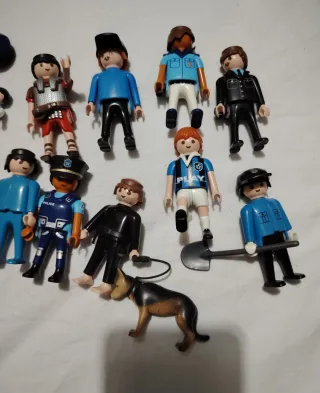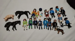 Lote variado de figuras y animales Playmobil. - Incluye dos caballos negros, un cerdo rosa y una figura de perro. - Varias figuras de personas con diferentes vestimentas, incluyendo uniformes. - Un pequeño objeto esférico azul.