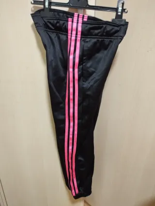 Pantalón deportivo Adidas para chica en color negro con detalles en rosa. - Cordón para ajustar la cintura. - Con bolsillos - Tres rayas deportivas en los laterales. - Logo de Adidas en rosa.