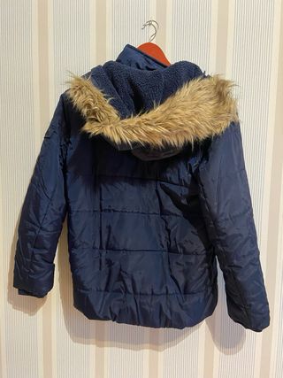 Abrigo azul marino de la marca Prenatal, ideal para bebés de 6 meses. Con un diseño tierno de oso. - Capucha forrada de borreguito con orejitas. - Cierre de botones. - Detalle de cara de oso en la parte delantera.
