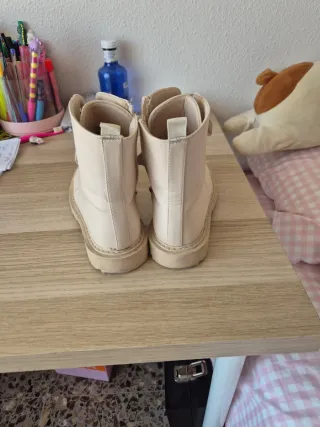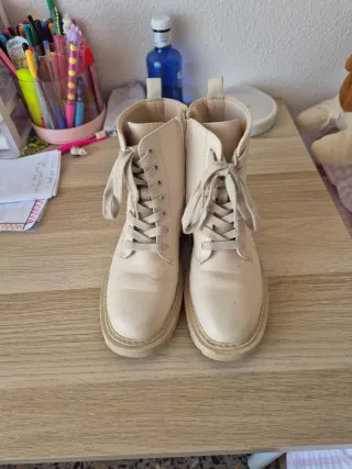 Botas de polipiel en color beige, talla 33. - Cierre con cordones. - Diseño tipo botín.