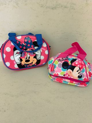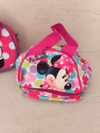 Set de dos bolsas con diseño de Minnie Mouse, ideal para meriendas o como neceser. - Bolsa principal con fondo rosa y lunares blancos. - Bolsa secundaria con estampado multicolor y Minnie Mouse. - Asas de color azul y rosa.