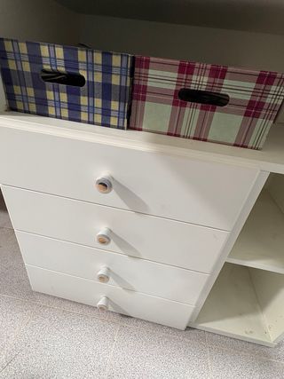 Cambiador de bebé de la marca IKEA. Ideal para organizar y cambiar al bebé de forma cómoda. - Estructura blanca. - Cajones con tiradores redondos. - Estantería lateral.