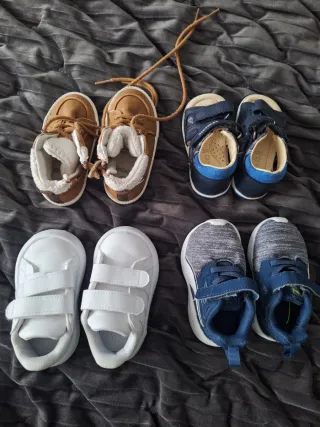 Entero lote de 4 pares de zapatos para niño en talla 20. Incluye varios pares para diferentes ocasiones. - Zapatillas deportivas blancas con velcro Adidas comfebubble. - Botines marrones con forro interior de pelo Obaibi. - Zapatos tipo sandalias azules con detalles Geox. - Zapatillas deportivas azules y grises con logo Puma.