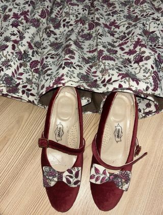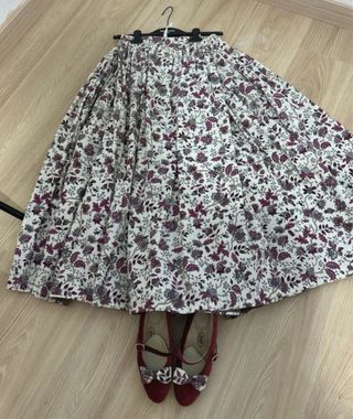 Falda de niña con estampado floral, ideal para trajes de fallera. - Diseño con flores moradas y detalles grises sobre fondo blanco. - Cintura fruncida para un ajuste cómodo. - Largo hasta los tobillos. Los zapatos son talla 35 y tengo mas tela de la falda La falda mide 93cm de largo