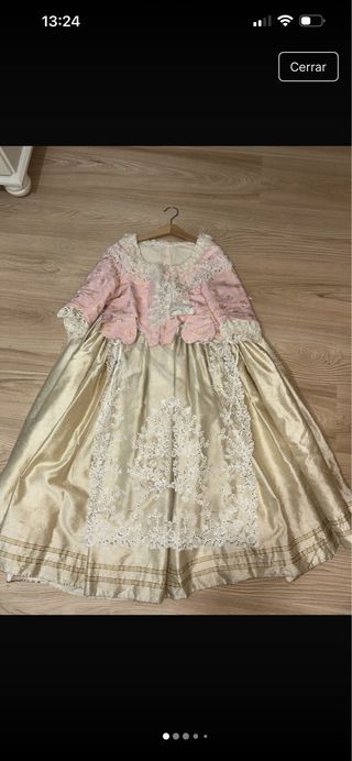 Traje tradicional de fallera para niña, con un diseño elegante y festivo. - Cuerpo en color rosa con detalles dorados. - Falda larga en tono dorado brillante. - Adornado con encaje blanco. - Mangas cortas con volantes de encaje. El precio es con el corpiño con manteletas se el corpiño que sale en la foto pequeño ya no esta disponible