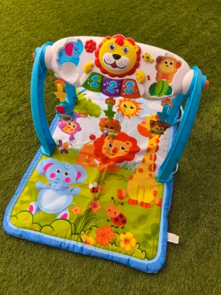 Gimnasio interactivo con múltiples actividades para el desarrollo del bebé. Diseñado con colores vivos y personajes divertidos. - Incluye arco de juegos con colgantes. - Alfombra acolchada con estampado de animales y números. - Estructura de plástico resistente y segura.