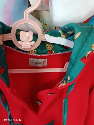 Vestido de manga larga para niña de la marca Chachi piruleta. - Color rojo principal. - Estampado de conejitos en verde en el bajo y la capucha. - Detalle de conejito en el frontal. - Cierre con botones en la parte superior. - con braguitas - de felpa Es nuevo sin usar