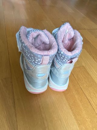 Botas de nieve para niña en talla 27. Perfectas para mantener los pies calientes y secos en climas fríos. - Diseño plateado con detalles de estrellas. - Forro interior rosa y mullido. - Cierre con velcro para un ajuste fácil.