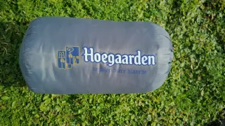 Saco de dormir de invierno promociónal de cerveza Hoegaarden. Temperatura confort 0 grados. Saco para llevarlo a prueba de agua. - Edición limitada. - Interior azul. - Exterior gris.