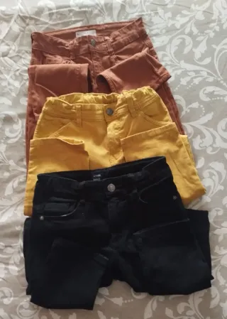 Lote de tres pantalones para niños o niñas en talla 9 años. Incluye un pantalón de color mostaza, uno negro y otro en tono terracota. - Pantalón color mostaza con cintura elástica. - Pantalón negro con detalles. - Pantalón color terracota.