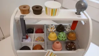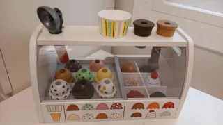 Divertido juego de helados de madera para crear tus propios postres. - Incluye helados de diferentes sabores y conos. - Dispensador de helados. - Cuchara para helados.