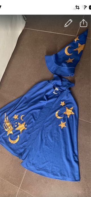 Conjunto de disfraz de mago en color azul, decorado con estrellas y lunas doradas. - Incluye capa. - Incluye sombrero de mago.