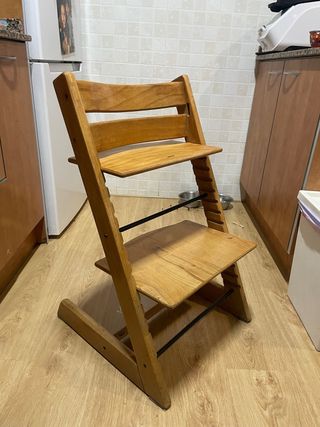 Trona de madera de la marca Stokke. Un clásico del diseño para acompañar el crecimiento del bebé. - Fabricada en madera. - Diseño ergonómico y adaptable. Comprada de segunda mano en wallapop y utilizada para mi hijo hasta los 5 años, tiene mucho trote pero va todo bien!