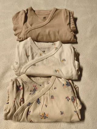 Lote de tres conjuntos de verano, para bebé niña, de la marca H&M, talla 68cm, compuesto de body + short: - 3 Bodies cruzados de manga corta. - 3 Pantalones cortos anchos. - 2 conjuntos estampado floral + 1 conjunto liso. - Tonos arena, beige y marrón. - Muy conodos y prácticos. - Tejido de algodón orgánico.