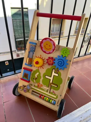 Correpasillos de madera con múltiples actividades para el desarrollo de los más pequeños. Diseñado para fomentar la motricidad y la coordinación. - Estructura de madera. - Incluye engranajes, laberinto y ábaco. - Decoración con motivos de animales y naturaleza. -Tiene una rueda suelta