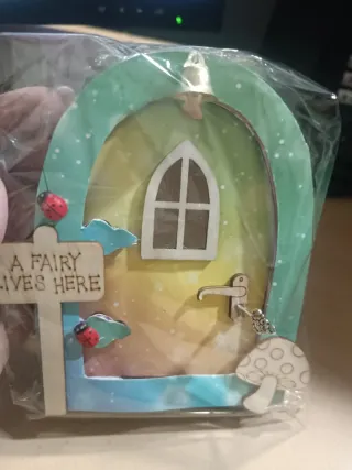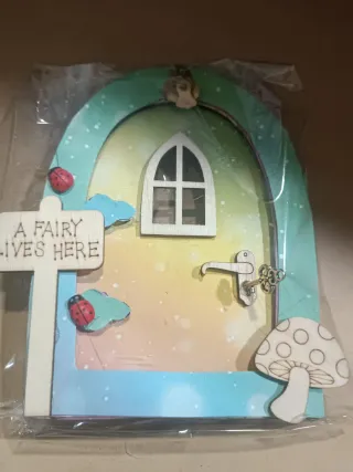 Encantadora puerta decorativa con temática de hadas, perfecta para añadir un toque mágico. - Diseño de puerta de hadas con arco. - Incluye ventana, pomo y llave. - Adornada con mariquitas y un hongo. - Señalización A fairy lives here.