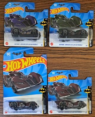 Hot Wheels 2022 - Batman: Arkham Asylum Batmobile. Lote que incluye las 3 variantes de color de esa serie. Solo hago Envíos a partir de 10 €. Se pueden combinar artículos entre anuncios. Vehículos en buenas condiciones. El blister y tarjeta pueden tener algún desperfecto por el almacenaje y manipulación, marca del precio... ver fotos antes de comprar ya que NO se aceptan devoluciones.