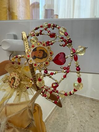 Disfraz de princesa Bella, Disney original, inspirado en la Bella y la Bestia. - Vestido dorado con detalles. - Incluye corona a juego y varita magica.