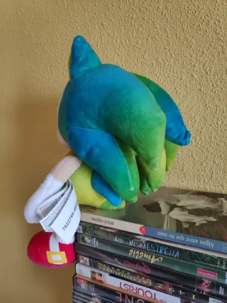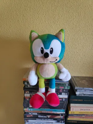 Peluche de personaje inspirado en Sonic, con un diseño colorido. - Colores principales: verde, azul, amarillo y rojo. - Guantes blancos y zapatos rojos.