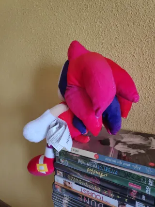 Peluche del personaje Sonic. - Cuerpo principal de color rojo y morado. - Orejas y parte interior de las orejas en color beige. - Brazos y manos de color blanco. - Pies de color rojo con detalles blancos.