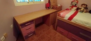 Cama juvenil con un diseño moderno y funcional, perfecta para organizar el espacio. - Estructura de madera. - Cajones de almacenamiento integrados. - Colores: morado y rosa.