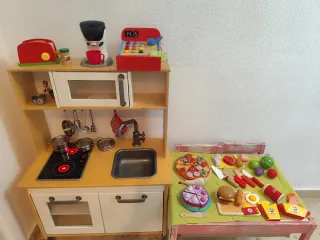 Divertida cocina de juguete de madera, ideal para que los más pequeños desarrollen su imaginación. - Incluye accesorios como tostadora, cafetera, caja registradora, microondas, fregadero, fogones, ollas y sartenes. - También vienen incluidos alimentos de juguete como pizza, pastel, hamburguesa, patatas fritas y frutas. - Cuenta con utensilios de cocina y vajilla.