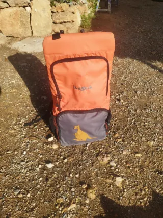 Mochila portabebés de color naranja con un diseño divertido. - Compartimento principal espacioso. - Bolsillo frontal con cremallera. - Estampado de canguro en la parte inferior. Portabebés de cintura, con respaldo. 40€ la mochila 15 el portabebés de cintura 50€ pack completo