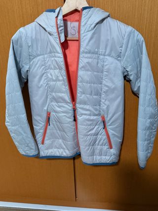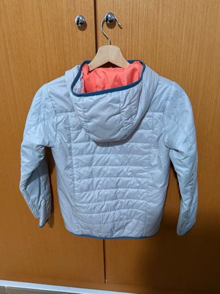 Chaqueta ligera de entretiempo de la marca Quechua. Perfecta para días frescos. - Color gris claro con forro interior naranja. - Cremallera frontal. - Dos bolsillos laterales con cremallera. - Capucha. - Puños y bajo con ribete azul.