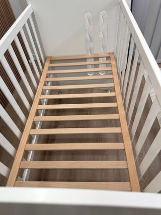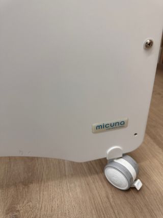 Cuna de bebé de la marca Micuna, con un diseño moderno y funcional. Ideal para el descanso del bebé. - Ruedas para facilitar su movilidad. - Etiqueta de la marca Micuna visible. - Conjunto cuna y colchon