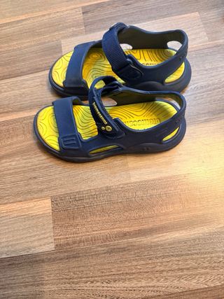 Sandalias Biomecanics en talla 29, con un diseño llamativo en azul y amarillo. - Cierre de velcro. - Suela con relieve. - Logo de la marca en la tira.